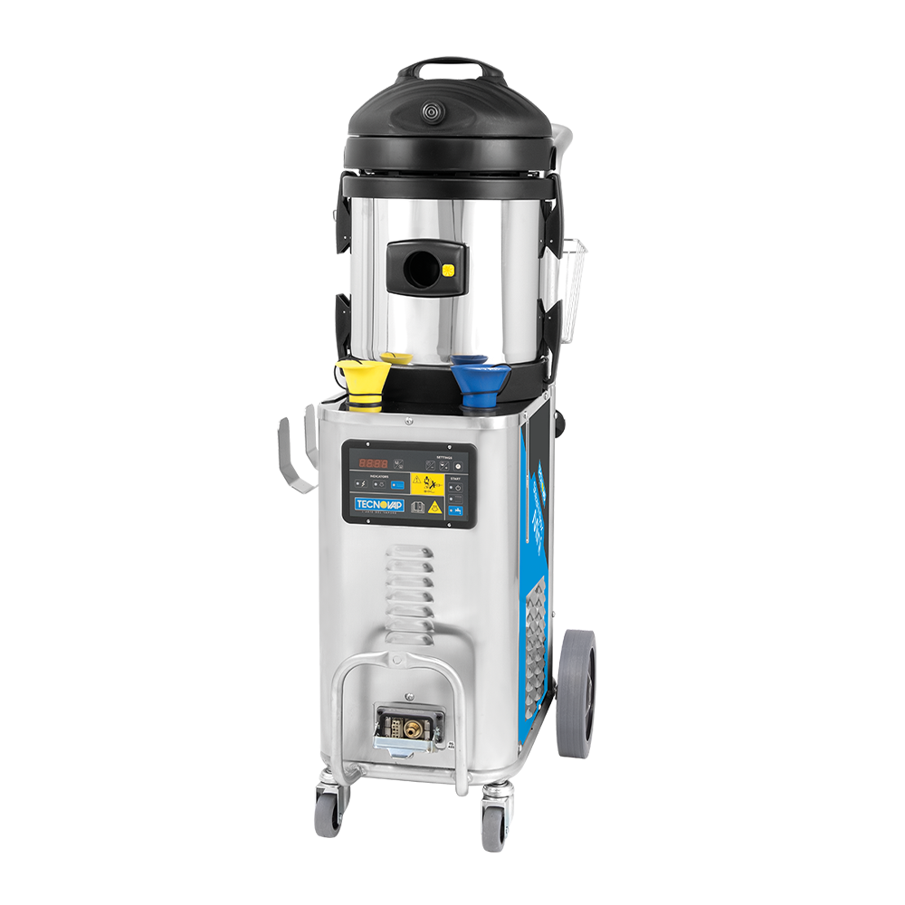 Steam cleaner with stainless-steel body and boiler, designed for professional use and able to deliver dry saturated