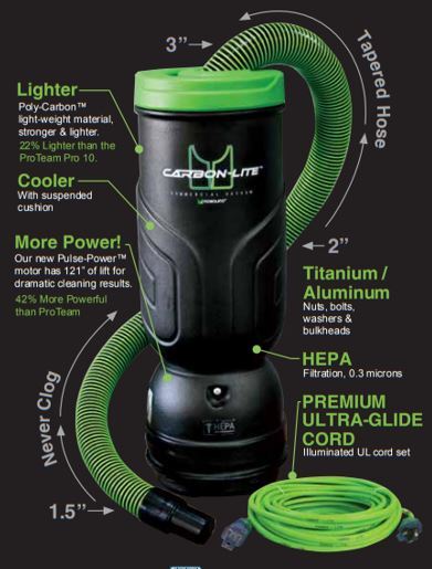 Mosquito’s new Carbon-Lite™ is simply the lightest, most powerful commercial backpack vacuum available today. New exotic Poly Carbon™ material combined with the industry’s most powerful Pulse Power™ motor gives you unmatched performance. The Carbon-Lite™ is the beginning of a true revolution in industrial backpack vacuum design and performance. Furthering our commitment to quality our new Carbon-Lite™ boasts an impressive 88% of components made in the USA